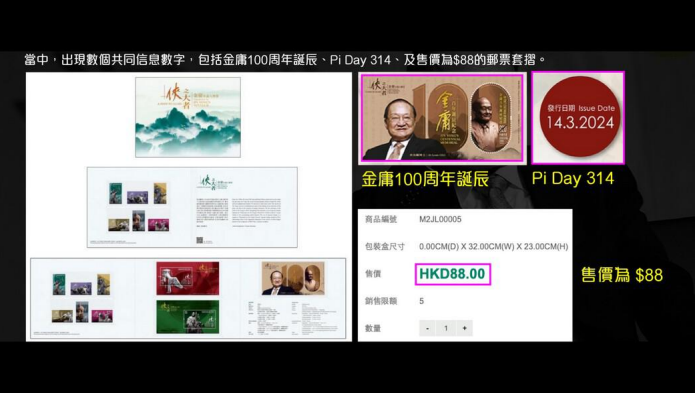 包括金庸 100 周年誕辰、Pi Day 314、及售價為$88 的郵票套摺。